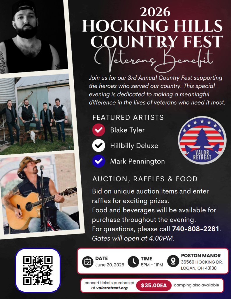 Due to the abundance of unique Black Hand sandstone, weathering and natural erosion over millennia, incredible beauty can be found in the fantastic rock formations and scenic features all throughout the Hocking Hills area. The area is known locally for its beautiful trails, majestic waterfalls, and dramatic cliff faces. We feel that the Hocking Hills area provides a beautiful, tranquil setting for veterans to begin to heal from wounds, visible and invisible. Quiet, serene nighttimes and star-filled skies await those that visit this scenic backdrop.